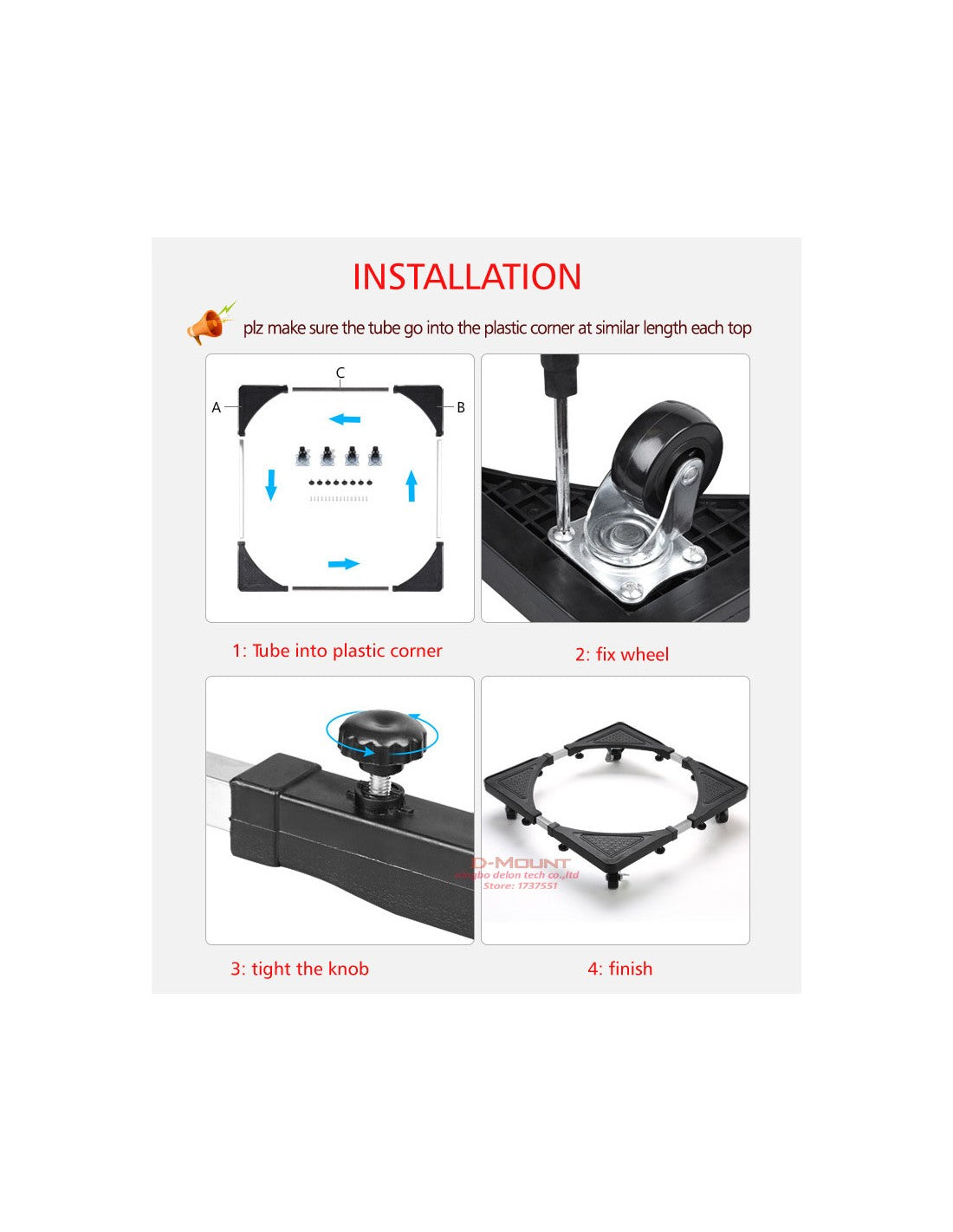 Base Ajustável com Rodas para Eletrodomésticos – Praticidade e MobilidadeTorne o transporte e a organização dos seus eletrodomésticos mais simples e práticos com esta base ajustável com rodas. Ideal para frigoríficos, máquinas de lavar, arcas congeladoras e outros equipamentos pesados.Características Principais:Tamanho Ajustável:Adaptável a diferentes dimensões de eletrodomésticos, garantindo um ajuste seguro e estável.Rodas Giratórias de Alta Qualidade:Facilita a movimentação em qualquer direção, sem esforço.Material Resistente:Construída em aço e plástico reforçado, suporta até 300 kg de peso.Fácil de Montar:Dispensa ferramentas complexas, permitindo uma instalação rápida e prática.Pés Antiderrapantes:Garante maior estabilidade e protege o piso contra riscos.Especificações Técnicas:Dimensões ajustáveis: 45-70 cm (largura)Altura: 10 cmCapacidade de carga: até 300 kgMaterial: Aço inoxidável e plástico reforçadoRodas: 8 rodízios com travão