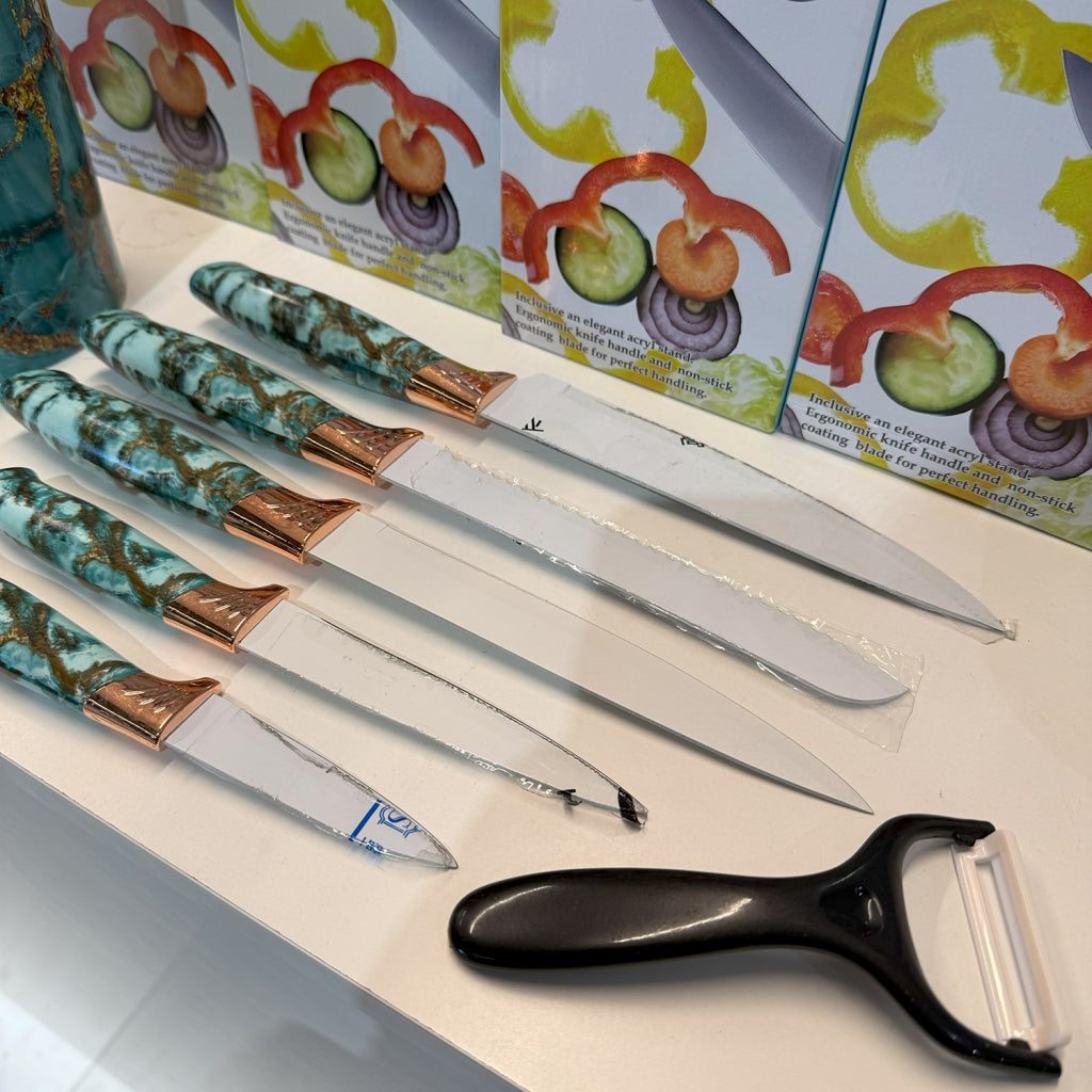 Conjunto de Facas Profissionais.Este conjunto de facas em aço inoxidável combina luxo e eficiência, ideal para quem aprecia churrascos perfeitos ou quer elevar a experiência culinária em casa. Com lâminas afiadas e design elegante, estas facas garantem cortes precisos e conforto no manuseio.Características Principais:Lâminas de aço inoxidável de alta qualidade: Resistentes à corrosão, garantem durabilidade e cortes perfeitos.Design luxuoso e ergonómico: Pega confortável para maior precisão e segurança durante o uso.Conjunto completo: Ideal para corte de carnes, legumes, pão e muito mais.Fácil de limpar e manter: Resistente ao desgaste diário.