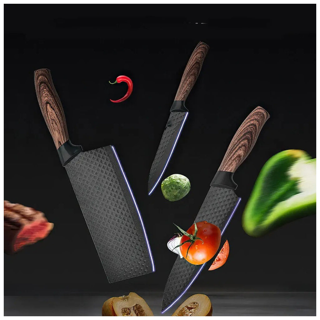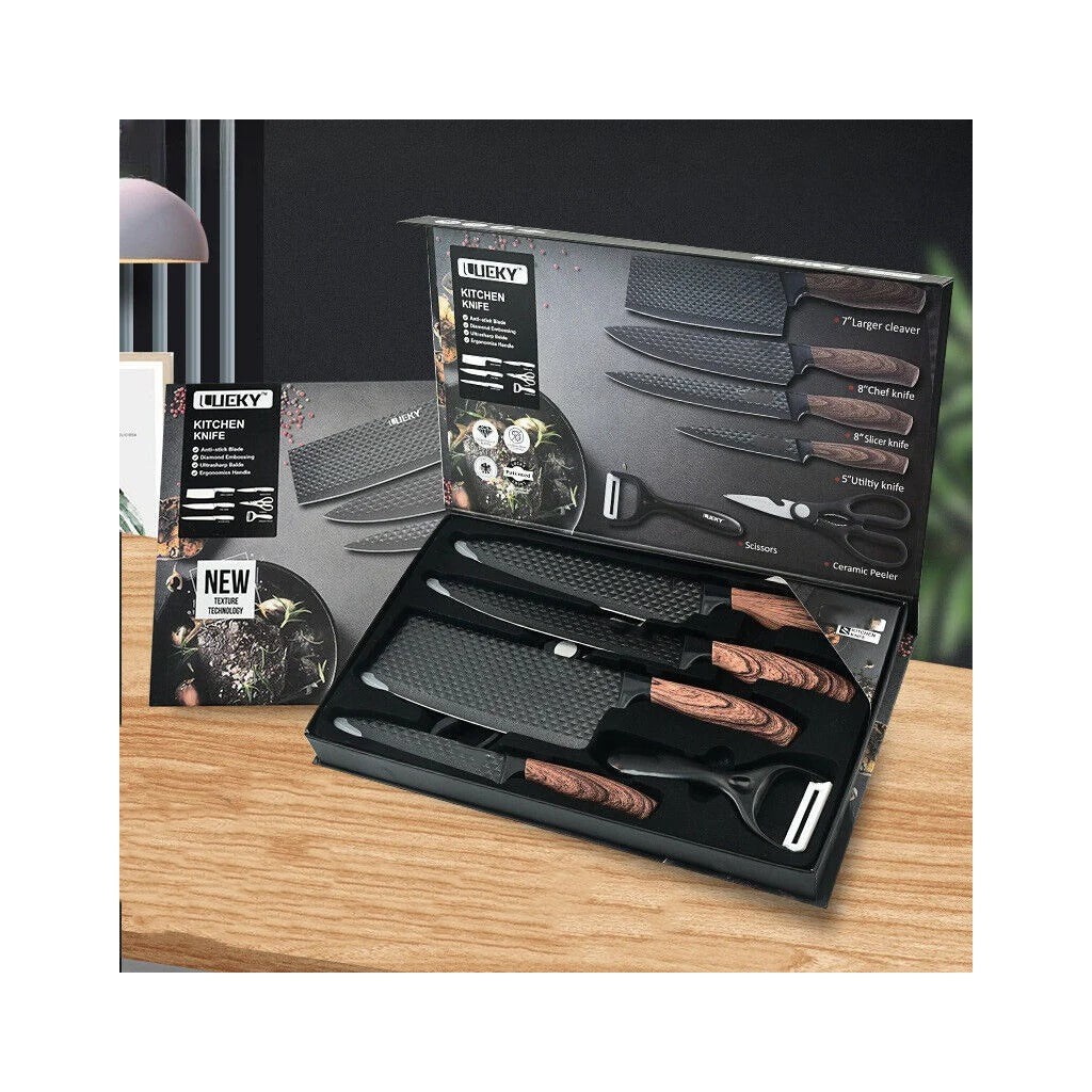 Conjunto de Facas de Cozinha Profissionais – Design PremiumEste conjunto de facas combina elegância e funcionalidade para oferecer um corte preciso e seguro em qualquer preparação culinária. Com acabamento texturizado e cabos ergonómicos, proporciona máximo conforto e controlo.Características:Conjunto Completo: Inclui 5 facas de tamanhos diferentes, tesoura multifuncional e descascador.Lâminas em aço inoxidável com acabamento texturizado: Reduz a aderência dos alimentos à lâmina e facilita o corte.Cabos ergonómicos em madeira: Design confortável e antiderrapante, ideal para uso prolongado.Durabilidade e resistência: Perfeito para cortes precisos de carne, peixe, legumes e frutas.Inclui acessórios essenciais: Tesoura de cozinha e descascador para maior versatilidade.Ideal para quem procura um toque profissional na cozinha, combinando estilo e eficiência num só conjunto.