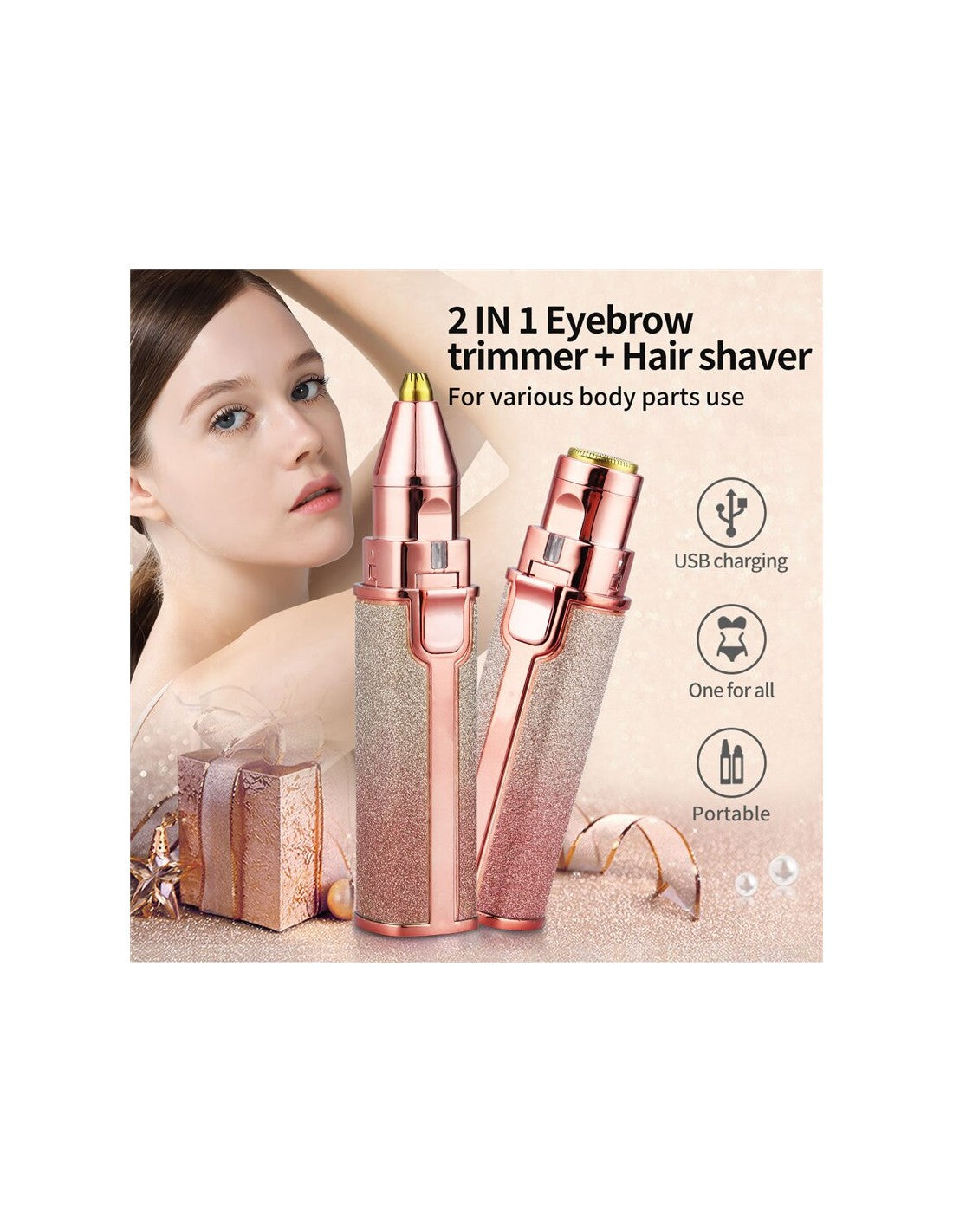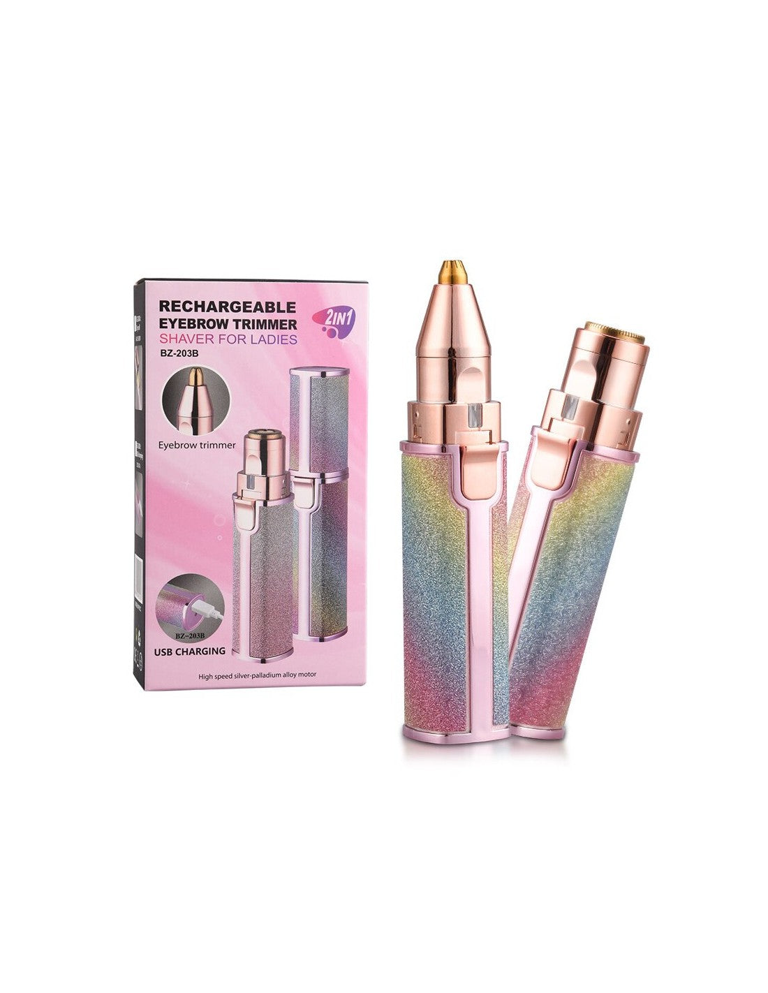 Aparador de Sobrancelhas Recarregável 2 em 1 BZ-203BTransforme a sua rotina de cuidados com este prático e elegante aparador de sobrancelhas 2 em 1. Ideal para eliminar pelos indesejados de forma precisa e confortável, mantendo um visual impecável em qualquer momento do dia.Características Principais:Design 2 em 1:Aparador de sobrancelhas e depilador facial num único dispositivo.Motor de Alta Velocidade:Feito em liga de prata e paládio, garantindo durabilidade e eficiência.Recarregável via USB:Elimine a necessidade de pilhas, garantindo maior conveniência e sustentabilidade.Cabeça Precisão:Perfeito para retoques em sobrancelhas e remoção de pelos finos.Portátil e Elegante:Design compacto, ideal para levar na mala e usar em qualquer lugar.Especificações Técnicas:Modelo:BZ-203BMaterial:Liga de prata-paládioCarregamento:USBPeso:Leve e portátilDimensões:Compactas para transporte fácilVantagens do Produto:Aparência elegante com acabamento brilhante.Elimina pelos indesejados sem causar irritações.Simples de limpar e manter.Ideal para uso diário e retoques rápidos.Este aparador é a solução perfeita para quem procura precisão, conforto e praticidade num único produto.