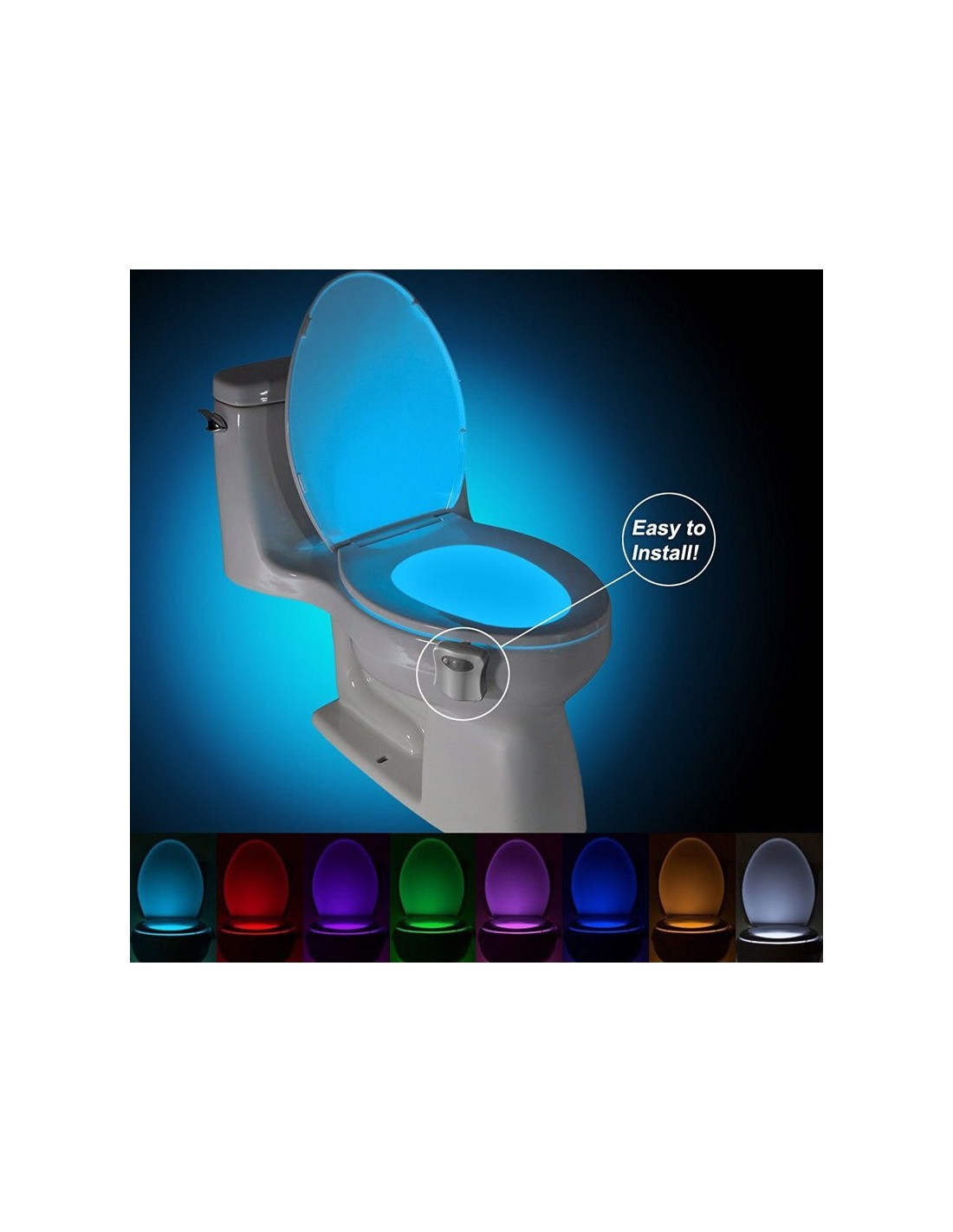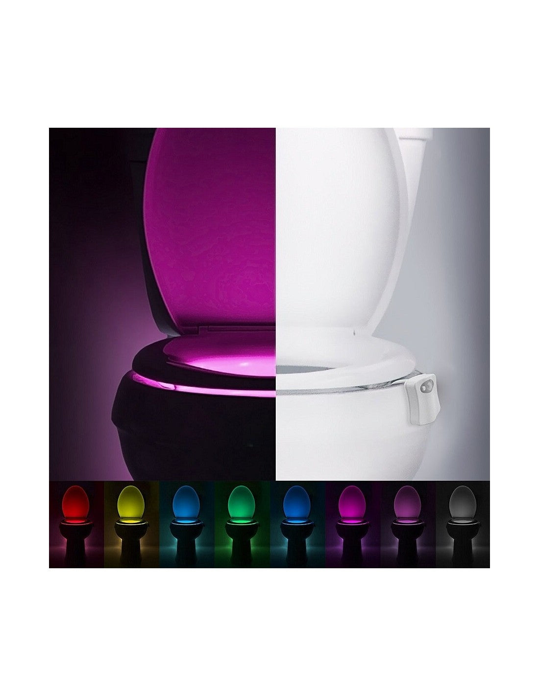Luz LED para Sanita com Sensor de MovimentoTransforma a tua casa de banho com esta prática luz LED para sanita, equipada com sensor de movimento e luzes coloridas. Ideal para uso noturno, oferece conforto e segurança sem necessidade de ligar luzes principais.Características Principais:Sensor de Movimento Inteligente:Liga automaticamente ao detetar movimento, desligando-se após 2 minutos de inatividade.Iluminação Colorida:Disponível em 8 cores ajustáveis, proporcionando uma experiência visual relaxante e moderna.Instalação Fácil:Fixação rápida e segura na borda da sanita, sem necessidade de ferramentas.Eficiência Energética:Funciona com 3 pilhas AAA (não incluídas), garantindo baixo consumo de energia.Resistente à Humidade:Projetada para suportar ambientes húmidos, sendo segura e durável.Especificações Técnicas:Alimentação: 3 pilhas AAAModos de iluminação: 8 cores ajustáveisMaterial: Plástico ABS resistentePeso: 90 g