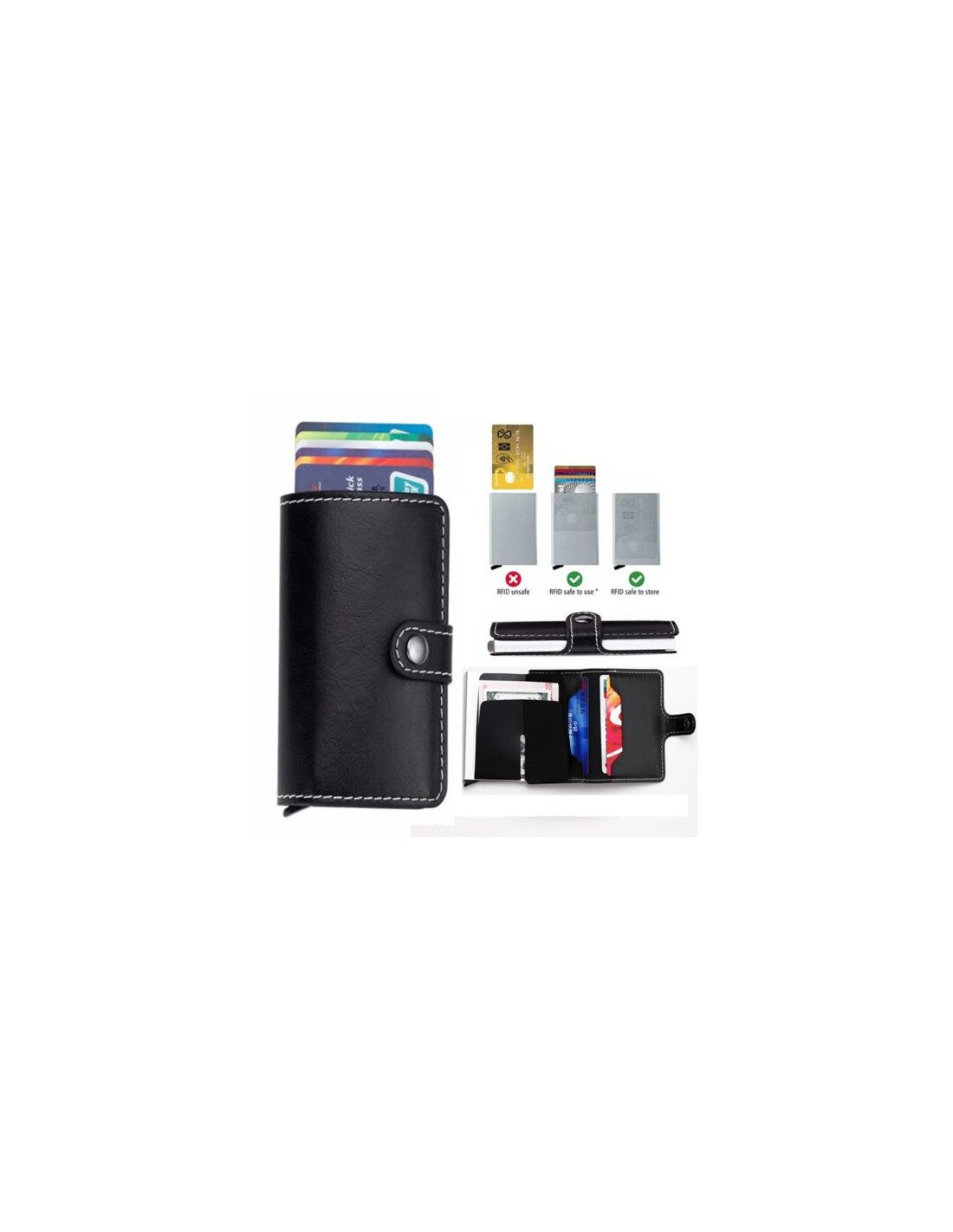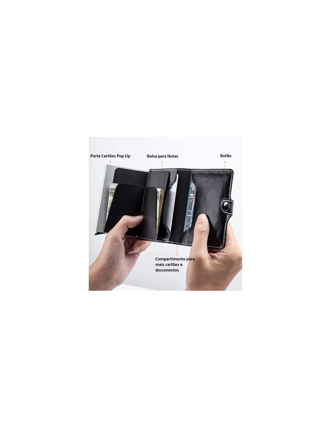 Porta-Cartões Compacto com Sistema Antirroubo – Elegância e SegurançaEste Porta-Cartões Compacto é a solução perfeita para quem procura praticidade, segurança e estilo. Com um design moderno e sofisticado, oferece proteção avançada contra clonagem de cartões, mantendo as tuas informações seguras.Características principais:Proteção RFID: Sistema antirroubo que bloqueia sinais indesejados, garantindo a segurança dos teus cartões.Sistema de Ejeção Inteligente: Acesso rápido e prático aos teus cartões com um simples toque.Material Resistente: Fabricado em couro sintético de alta qualidade, garantindo durabilidade e um toque elegante.Design Compacto e Minimalista: Cabe facilmente no bolso, ideal para o dia a dia ou viagens.Capacidade Ideal: Armazena até 6 cartões, além de compartimento extra para notas.Especificações técnicas:Dimensões: 10 cm x 7 cm x 2 cmMaterial: Couro sintético e alumínio internoCor: Disponível em preto clássicoCapacidade: Até 6 cartões + espaço para notas