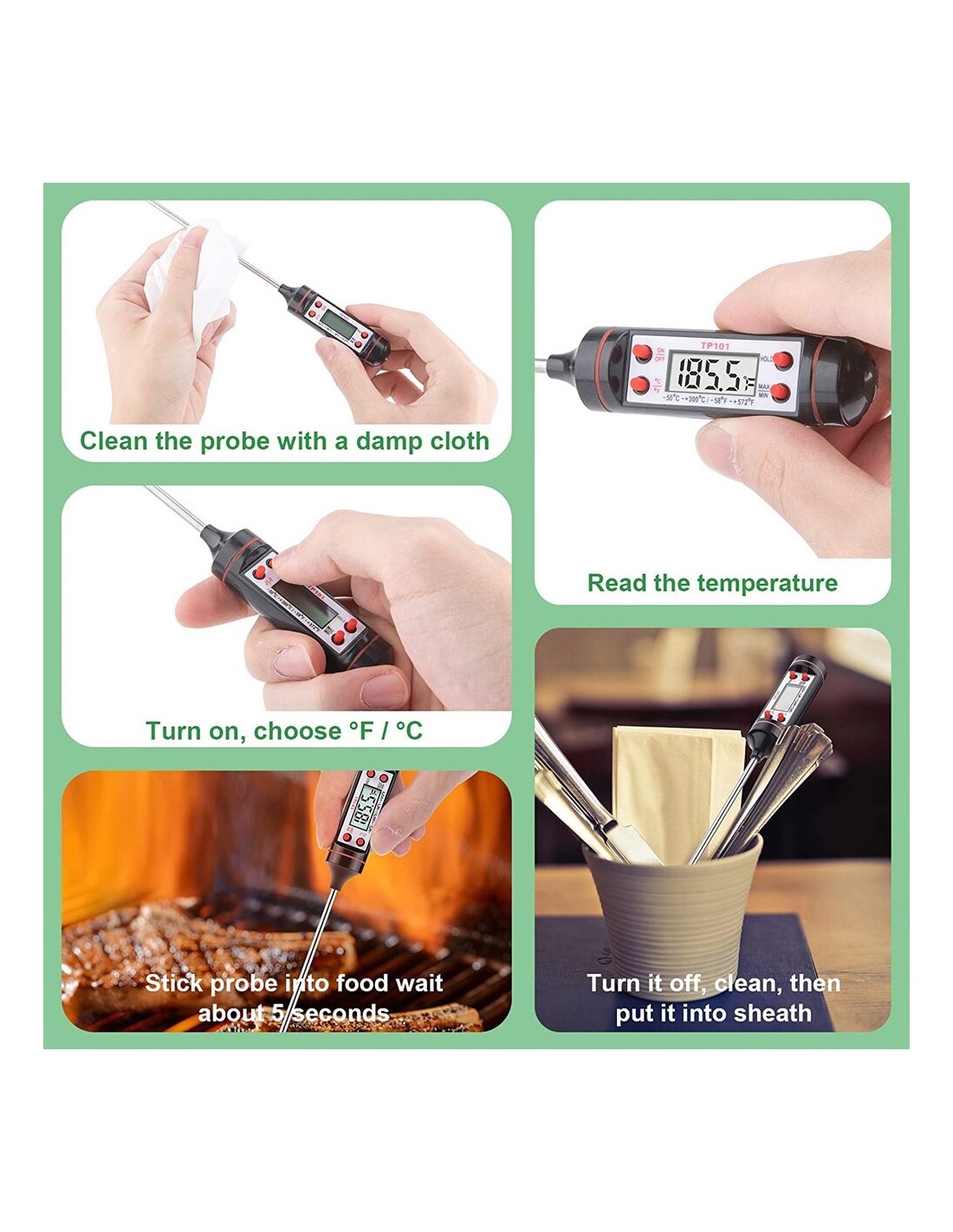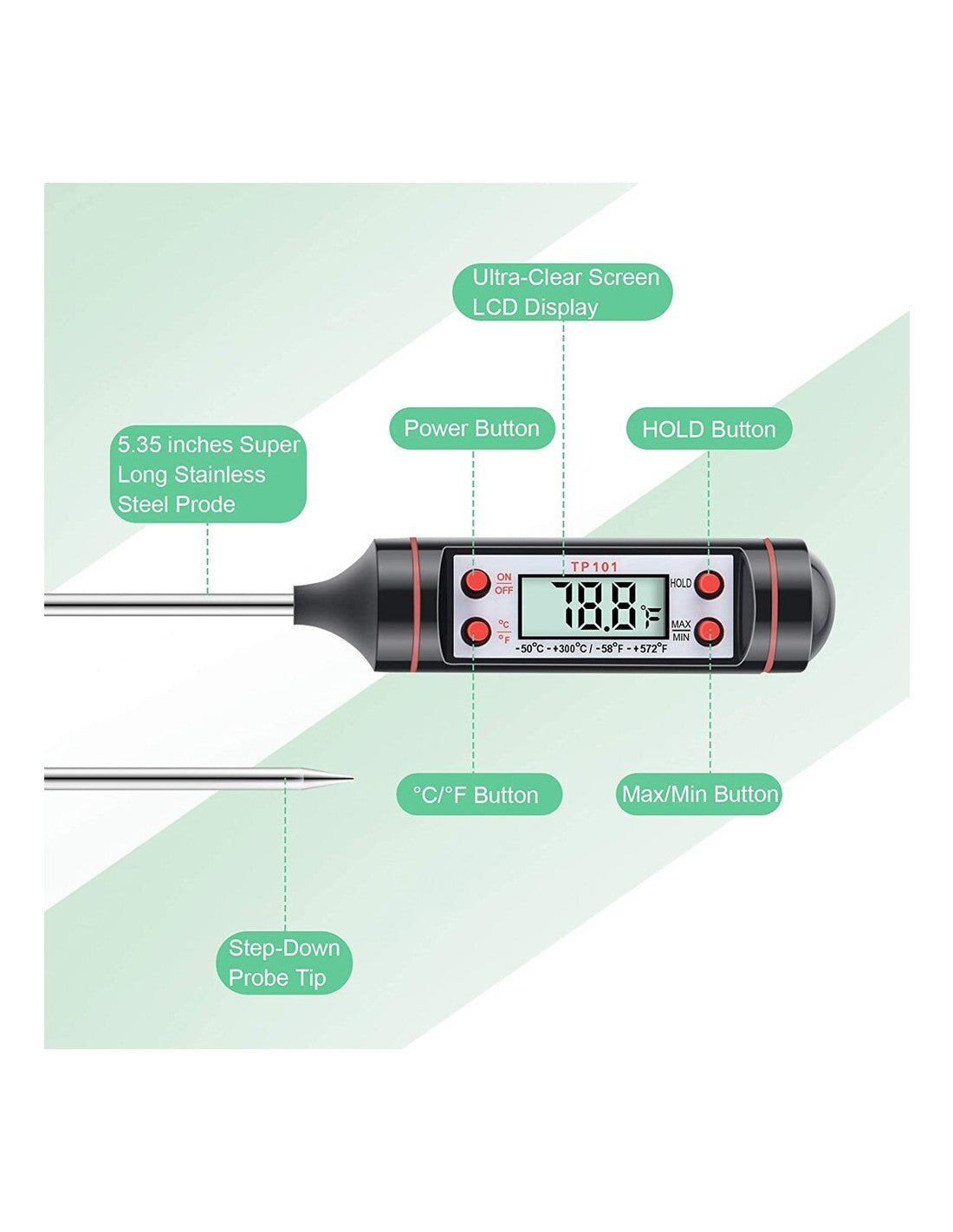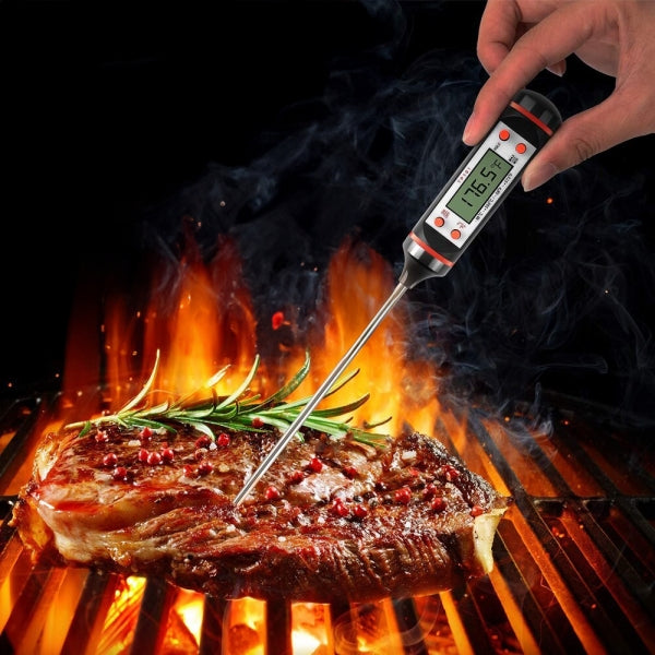 Termómetro Digital para Cozinha – Precisão e Rapidez na MediçãoO Termómetro Digital para Cozinha é o aliado perfeito para garantir a temperatura ideal em carnes, sopas, bolos e muito mais. Essencial para chefs e amantes da cozinha que procuram resultados perfeitos em cada receita.Características principais:Leitura Instantânea: Mede a temperatura em apenas 5-6 segundos.Alta Precisão: Precisão de ±1°C, ideal para receitas exigentes.Ampla Gama de Temperaturas: De -50°C a 300°C, adaptado a diversos tipos de cozinhados.Ecrã Digital Claro: Facilita a leitura da temperatura em qualquer ambiente.Material Resistente e Higiénico: Sonda em aço inoxidável, fácil de limpar e durável.Especificações técnicas:Intervalo de temperatura: -50°C a 300°CPrecisão: ±1°CTipo de pilha: LR44 (incluída)Comprimento da sonda: 14 cmPeso: 50 g